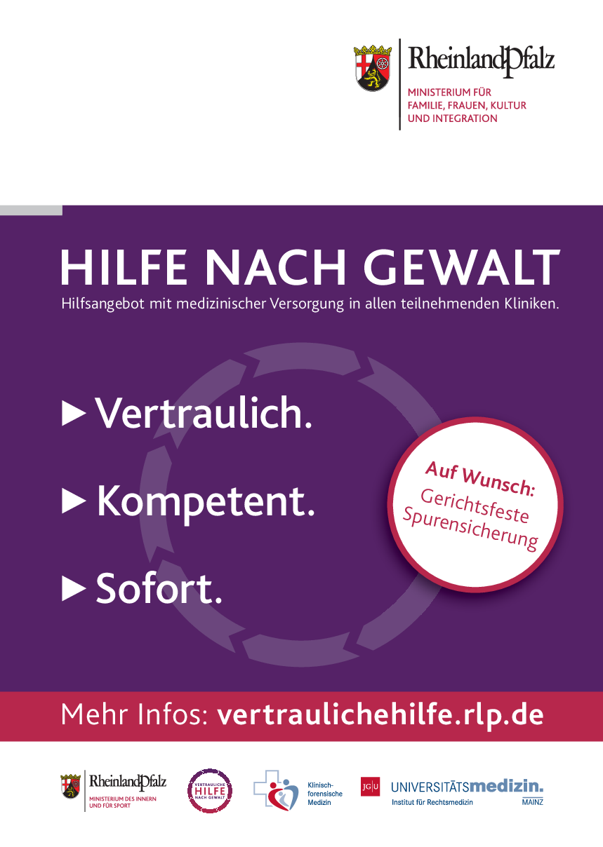 Mit dem Angebot “Vertrauliche Hilfe nach Gewalt” möchten wir sicherstellen: Sie als gewaltbetroffene Frau können sich in Kliniken in Rheinland-Pfalz kostenlos und vertraulich medizinisch versorgen lassen. Die medizinische Versorgung unterliegt dabei immer der ärztlichen Schweigepflicht. Denn wir wissen: Frauen, die vergewaltigt wurden oder von häuslicher Gewalt betroffen sind, lassen sich – aus Angst, zu einer Strafanzeige gedrängt zu werden – oftmals nicht medizinisch versorgen. Häufig stammt der Täter nämlich aus dem eigenen sozialen Umfeld.